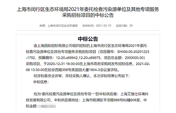 成功中标“上海市闵行区生态环境局2021年委托检查污染源单位及其他专项服务采购招标项目”
